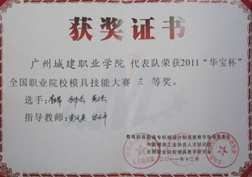 12月9日——11日,2011“华宝杯”全国职业院校模具技能大赛在宁波市宁海浙江工商职业技术公司举行,我系模具教研室主任贾凤英带领模具设计与制造专业09级李瑞、冯伟杰、黄子杰三位同学参加了本次比赛,最终喜获三等奖。