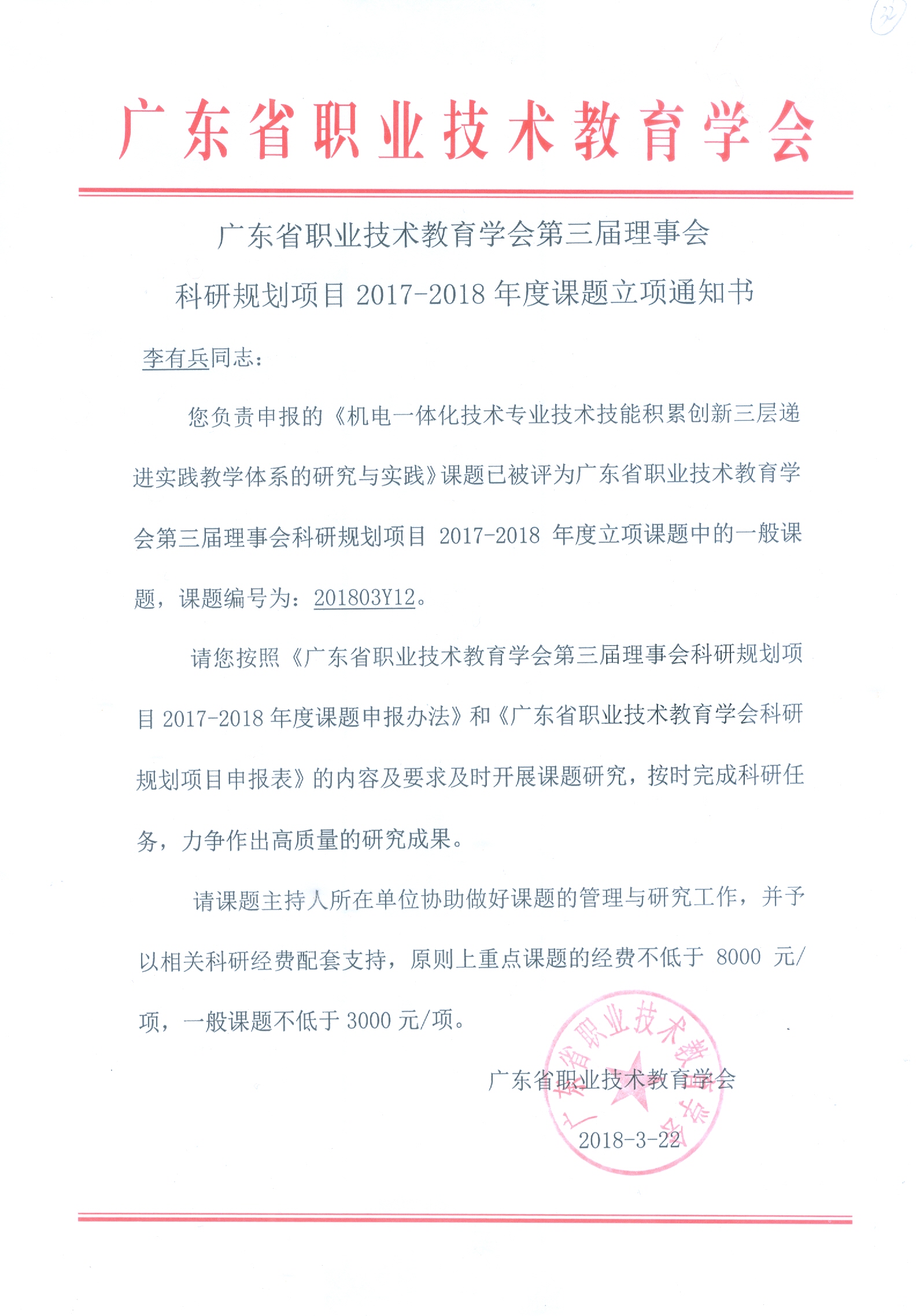 公司获广东省职业技术教育学会第三节理事会科研规划项目2017-2018年度课题立项