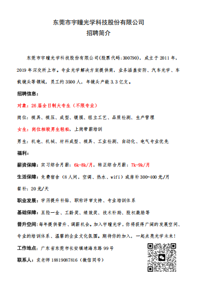 东莞市宇瞳光学科技股份有限公司成立于2005年,是国内领先的光学镜头及影像解决方案提供商。公司总部位于广东东莞,拥有完善的研发、制造和销售体系。自成立以来,企业始终秉持“创新驱动、品质为本”的发展理念,专注于高性能光学镜头的设计与制造,产品涵盖智能安防、车载影像、运动相机、工业检测、无人机、智能家居等多个领域,业务遍及全球市场。