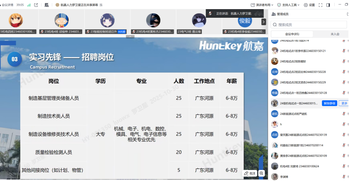 为深入推进公司2026届毕业生就业工作,促进校企合作与人才交流,10月30日下午,航嘉集团(河源园区)受邀通过线上平台开展企业专场宣讲活动,为毕业生搭建了了解电源行业发展趋势与就业机会的重要平台。