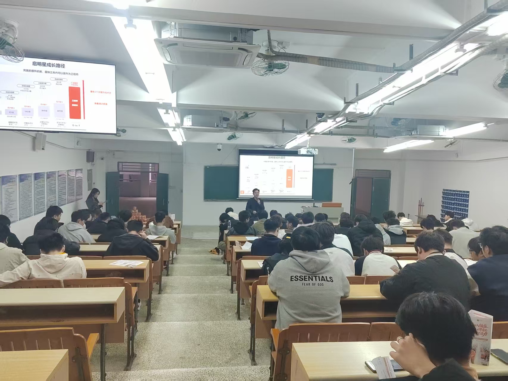 企业代表通过详实的案例与数据,重点展示了公司的技术创新布局、智能化生产体系及未来战略规划,帮助同学们洞察电子制造行业的演进趋势与人才需求方向。在招聘宣讲环节,企业面向应届毕业生提供了涵盖生产管理、品质工程、设备维护、工艺技术、行政职能等多个类别的优质岗位,并就岗位职责、晋升通道、培训体系及薪酬福利等员工关切的内容进行了清晰解读。