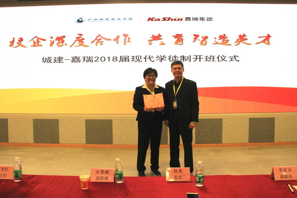 余慧姗总经理表达了对首届现代学徒制班级的深厚期望和全力支持。她表示,嘉瑞将提供物资、技术和企业实践类培训,让同学们通过现代学徒制班学习,能够在毕业之后更好更快地融入企业和社会。