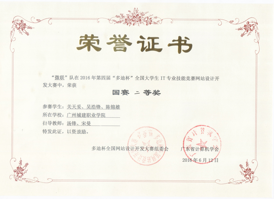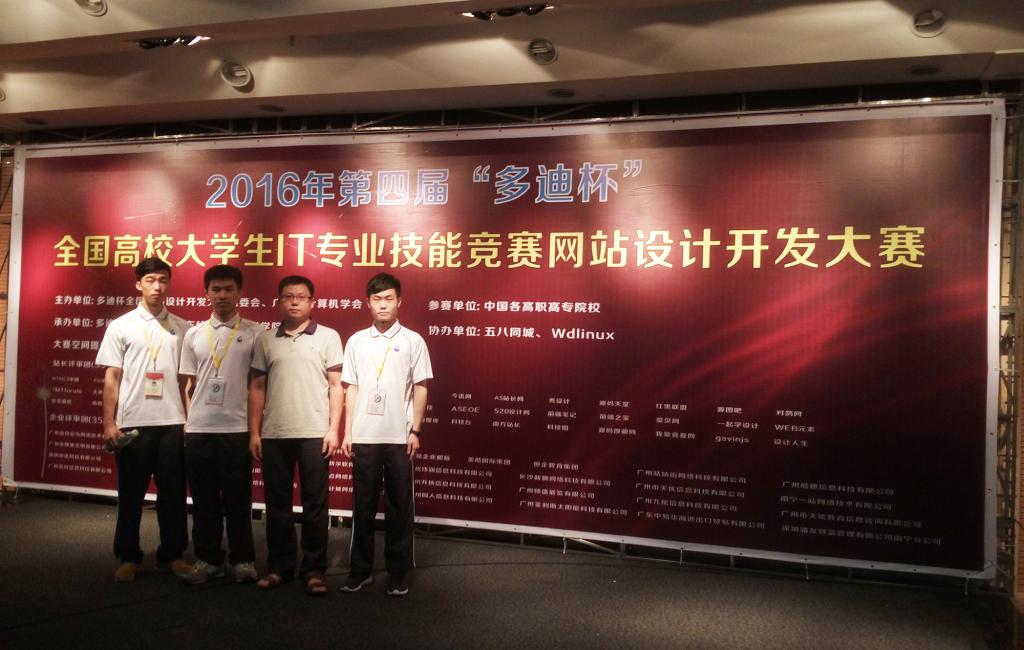 6月12日,由广东省计算机学会主办的第四届“多迪杯”全国网站设计开发大赛现场总决赛在广东岭南职业技术公司落下帷幕,由汤锋、宋曼老师指导,关天妥、吴浩锋和陈锦雄同学创作的作品《一起换》最终闯入决赛获得二等奖。