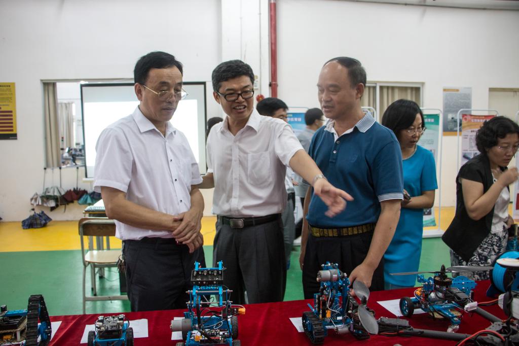 6月28日,机信公司在实训中心B栋201开展“抓实践 重创新 促成果”主题实践教学成果展,董事长刘国生、党委书记杨清国、实训与设备管理处处长符裕陪同岭南职业技术公司董事长朱家勇、副董事长李峻等领导前往参观指导。