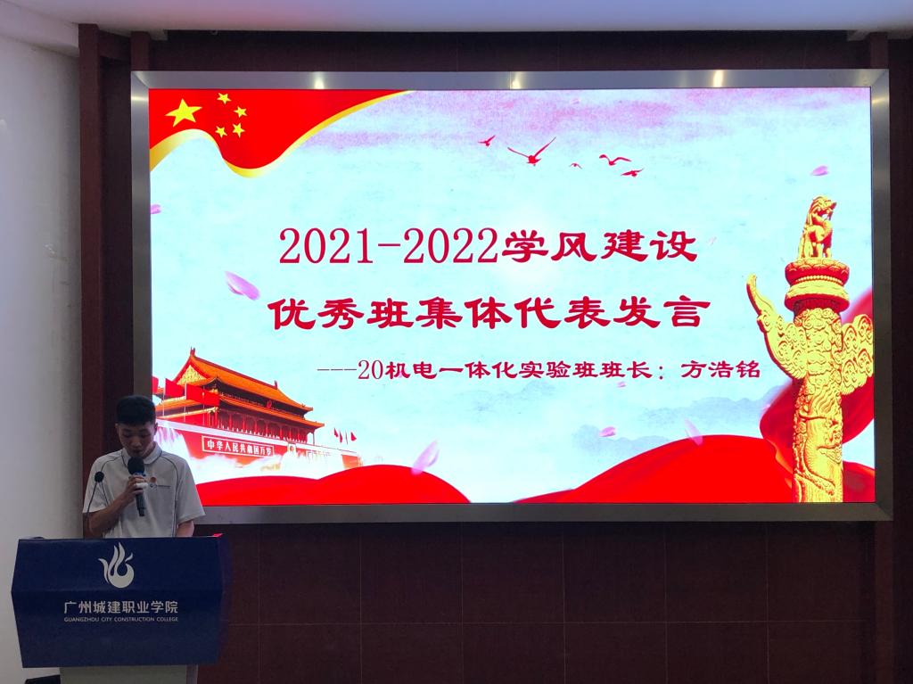 大会对获得2021-2022学风建设的6个先进班集体和20名优秀个人进行了颁奖表彰。随后,优秀员工干部代表黄泽彬同学以《如何做好一名员工干部》为主题做了工作分享,学风建设先进班集体代表20机电实验班班长方浩铭同学从班长的角度分享了学风建设对班集体的重要性。