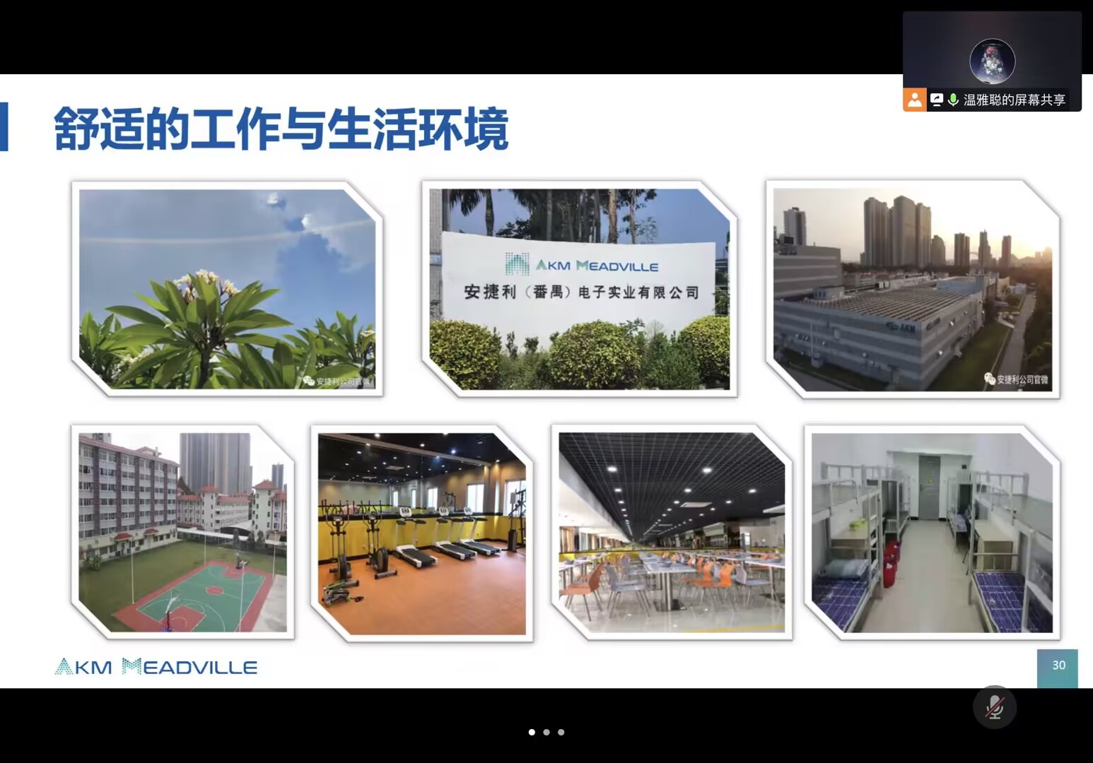 会上,专员温雅聪通过播放宣传片、PPT展示、线上交流等方式向同学们介绍了公司的概况、企业文化、职业发展方向、人才定位、福利待遇以及食宿环境等,此次计划招聘的岗位是储备干部和技术员。随后,在互动交流和答疑环节上,员工就工作岗位、福利待遇、食住行及上班时间等踊跃提问,专员温雅聪一一回答了员工提问。最后,专员温雅聪表示安捷利美维电子(厦门)有限责任公司欢迎同学们加入,希望同学们能踊跃投递简历。