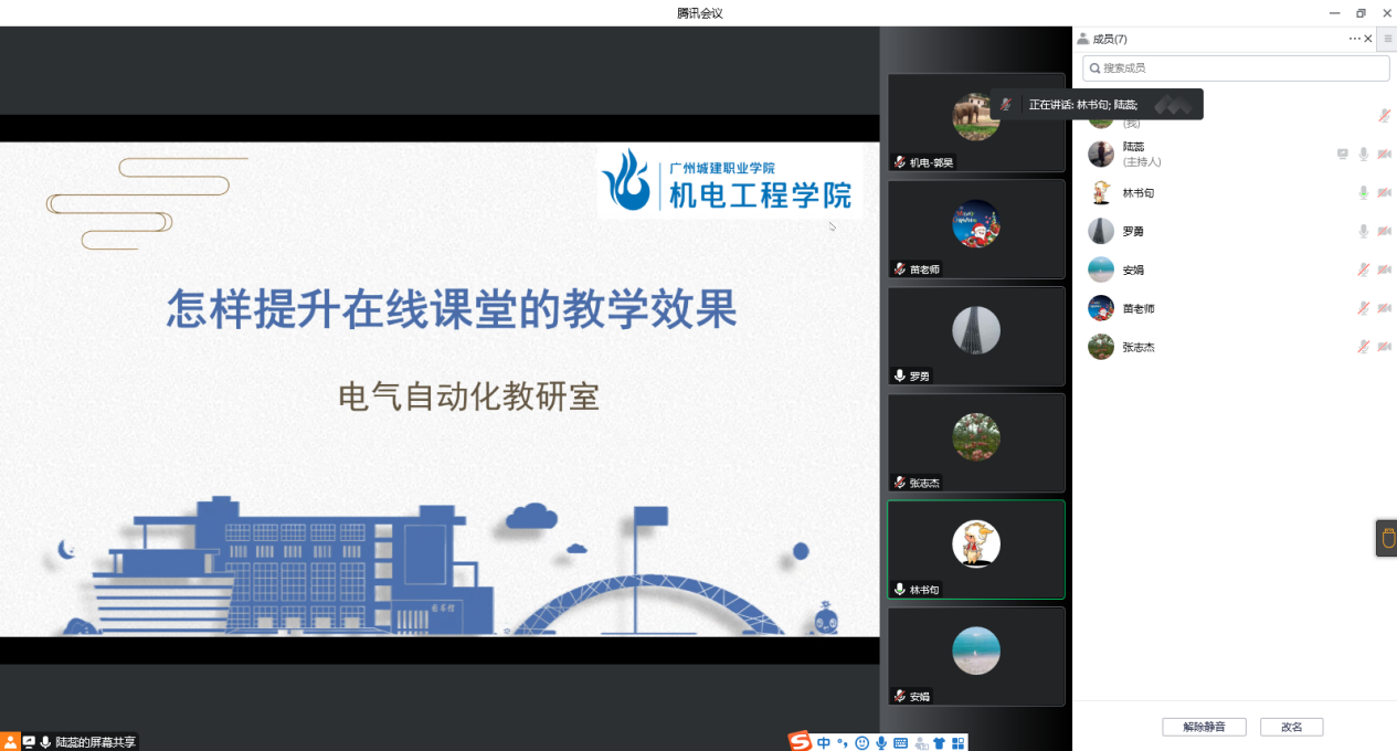 12月8日下午,电气自动化教研室使用腾讯会议客户端召开了关于“怎样提升在线课堂的教学效果”线上研讨会。会议由教研室主任陆蕊主持,教研室全体老师参加了这次会议。