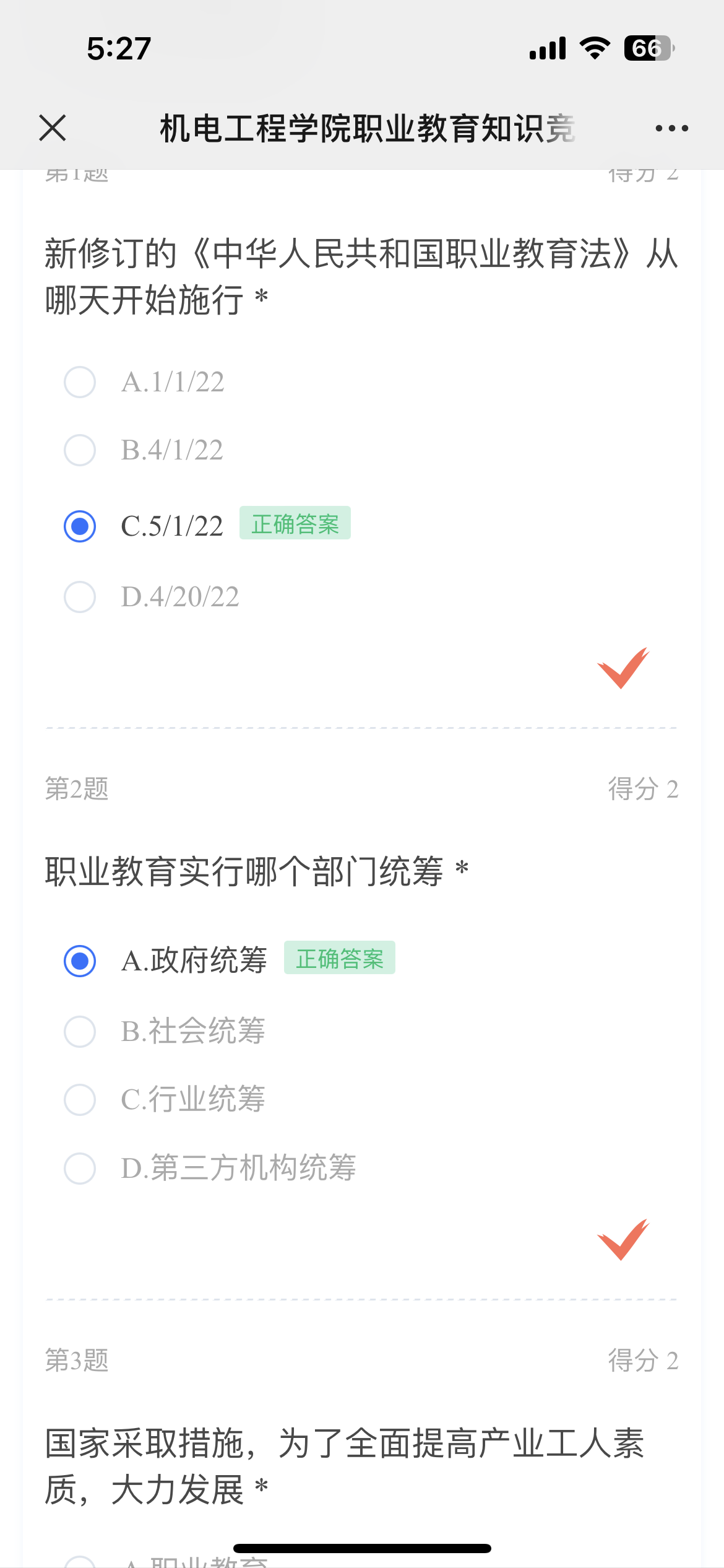本次活动利用线上问卷平台,鼓励公司教职工参与到“职业教育知多少”知识问答活动中,问答内容覆盖职业教育基本常识、我国职业教育现状、新修订的《职业教育法》等知识,激发公司教职工学习职教知识主动性与积极性。活动期间,公司高度重视,精心组织,有效落实,教师认真学习职业教育相关政策文件,踊跃参与线上答题,反响热烈。根据活动规则,最终评选出一等奖1名、二等奖2名、三等奖3名,共6名获奖人员。