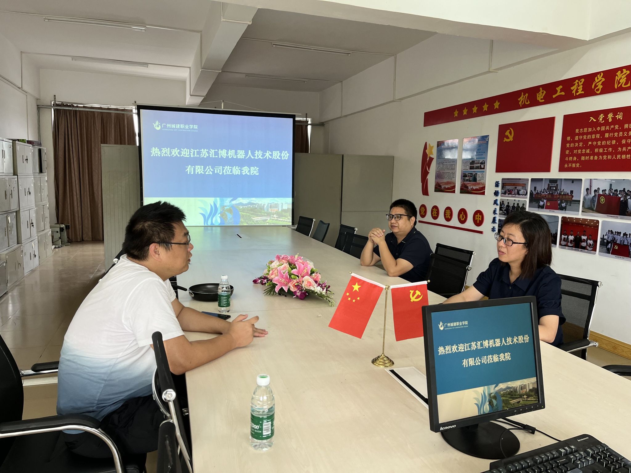 2023年6月16日,江苏汇博机器人技术股份有限公司一行人来到公司,就校企合作进行洽谈。副经理李有兵、牟海荣热情地接待了来宾。