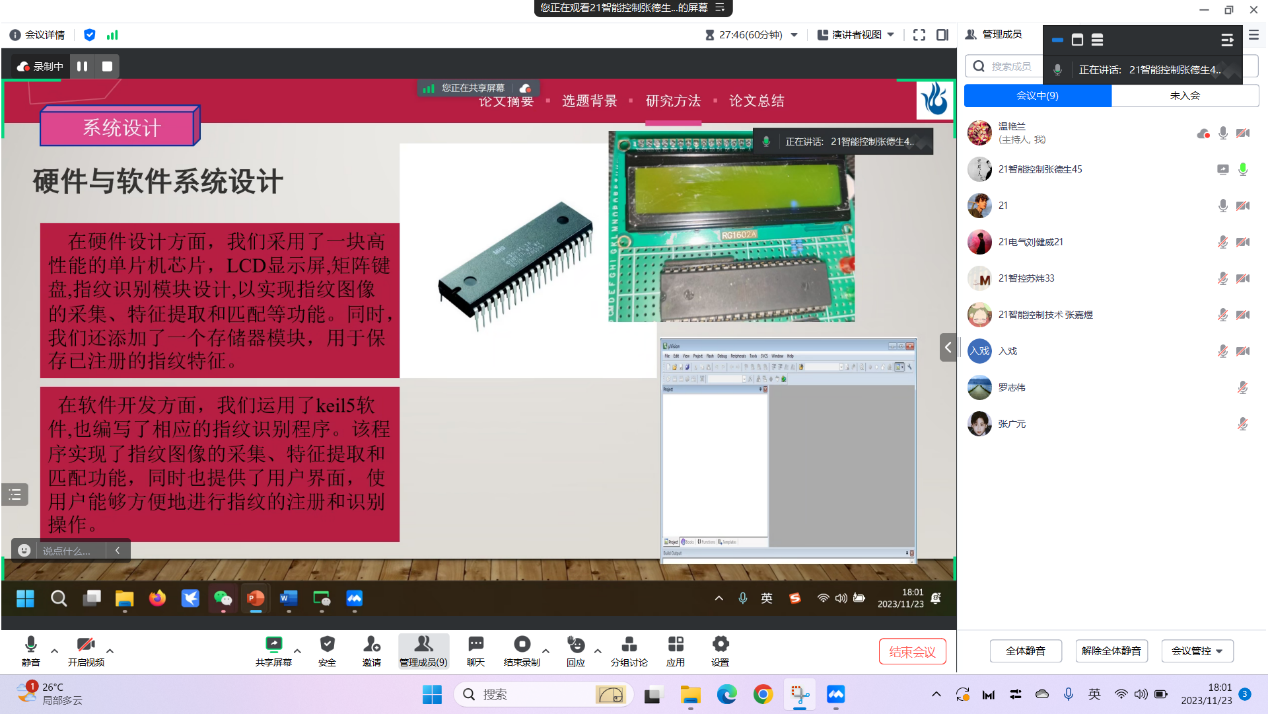 2023年11月23日下午,电气自动化教研室2024届毕业答辩会在教学楼1110和1111教室举行,电气自动化技术、智能控制技术专业的94名员工参与了答辩,参加此次答辩会的评委老师有苗晓培、罗志伟、赵一丁、罗勇、张志杰、林书句、温艳兰等教研室老师。本次答辩采用线上线下相结合的方式进行。