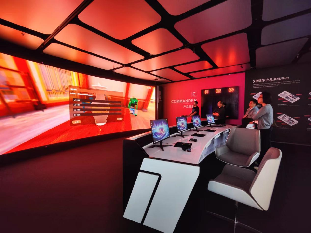牟海荣一行首先参观了曼恒数字的XR数字应急演练平台、VR行业解决方案和VR游戏产品展示区域,并进行了新能源汽车维修虚拟仿真沉浸式体验。