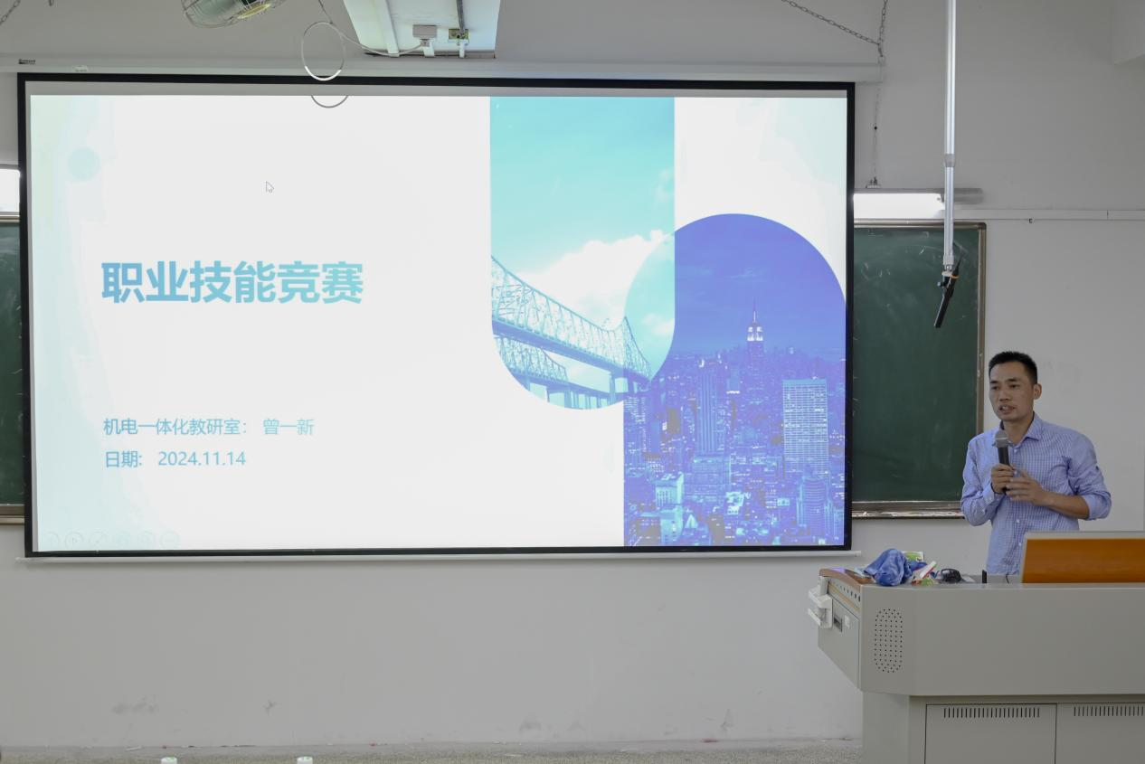 接着,广东省职业院校技能大赛员工专业技能竞赛一等奖项目指导老师、伟德国际1946亚洲版机电一体化教研室主任—曾一新副教授做了《职业技能竞赛》的专题分享。曾一新详细介绍了职业技能竞赛的背景、意义以及参赛要求。他指出,职业技能竞赛是提升员工职业技能和就业竞争力的重要途径,希望同学们能够认真对待每一次竞赛机会,努力提升自己的职业素养和实践能力。曾主任的分享让同学们对职业技能竞赛有了更加深入的了解和认识。