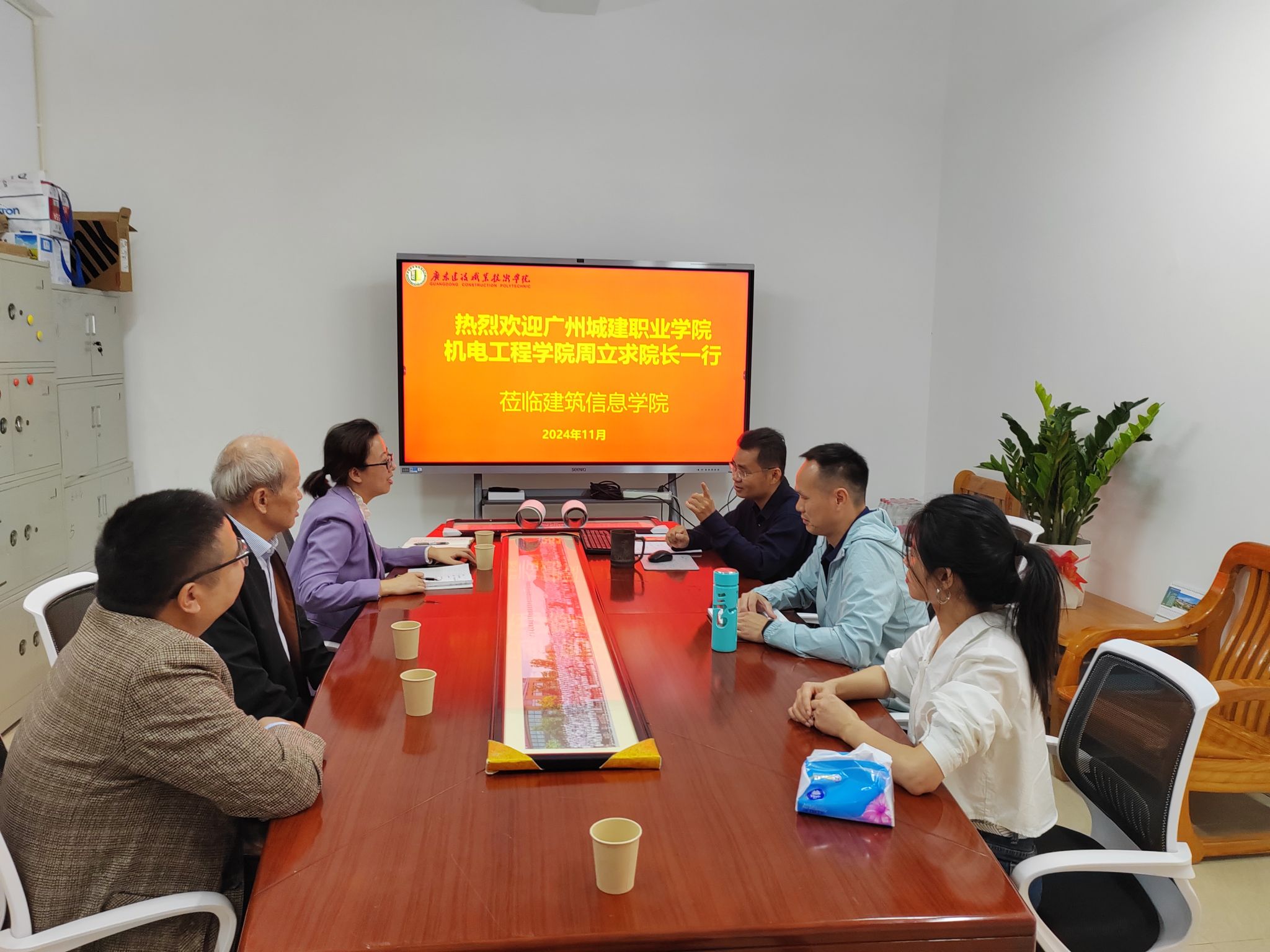 广东建设职业技术公司建筑信息公司经理王咸峰及教师展示了他们在相关领域的教育实践和研究成果。双方就当前职业教育面临的挑战和机遇、尤其是如何更好地服务于地方经济发展和社会需求进行了深入的交流。