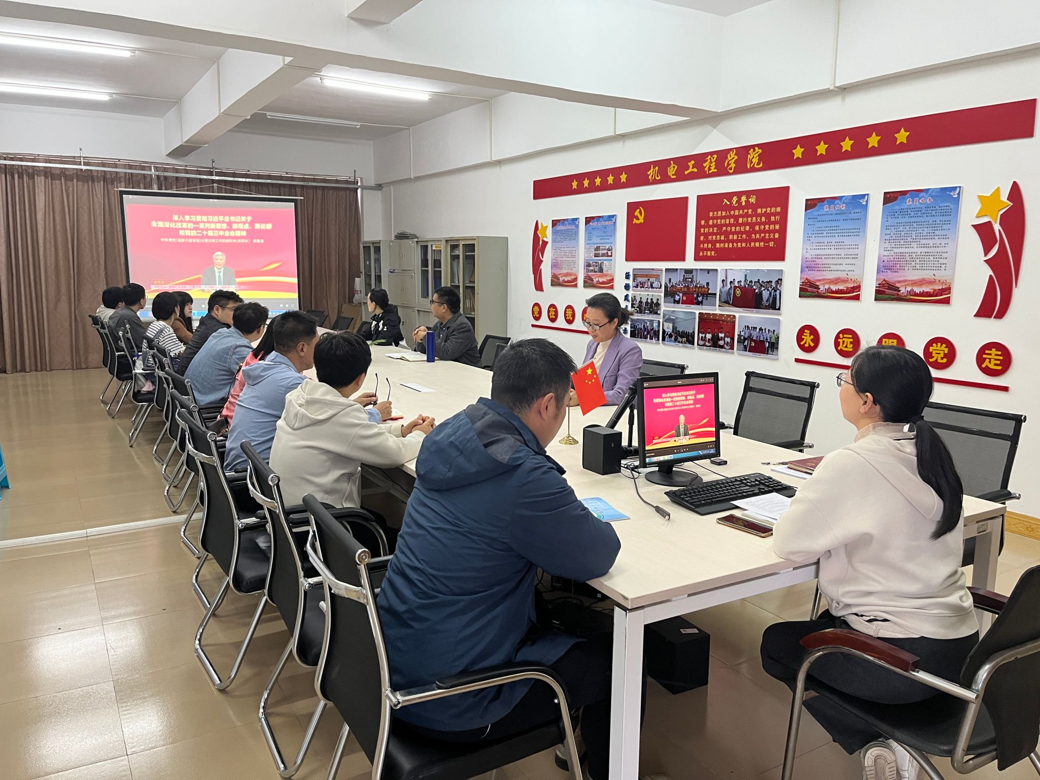 党员教师们认真聆听讲解,积极参与讨论。党员教师纷纷表示“通过学习,我们更加明确了肩负的责任与使命,在今后的教学中,要注重培养员工的创新精神和实践能力,为国家培养更多高素质的专业技能人才,以实际行动推动教育改革发展。”