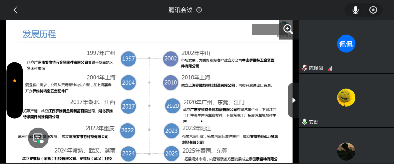 2025年5月27日晚,广东罗维特金属制品有限公司在腾讯会议线上开展了2025年“厂中校”系列宣讲招聘活动。罗维特公司是各类抽芯铆钉、铆螺母、压铆件、国标(汽标)紧固件、非标紧固件、铆接工具的专业生产公司,拥有先进的整套生产设备和自动车床,采用国际先进标准生产的“Rivet”牌紧固件已达国际一流水平。