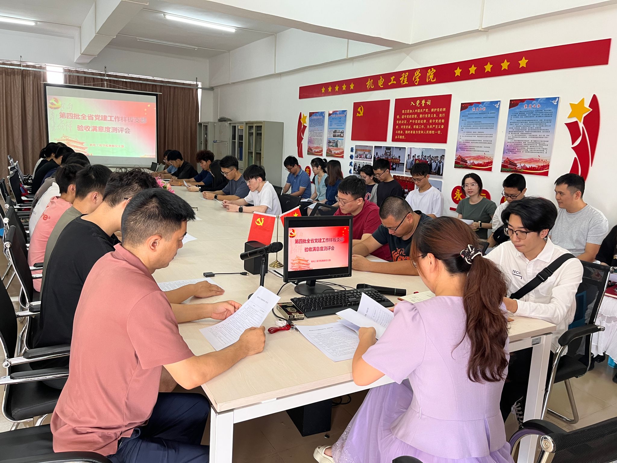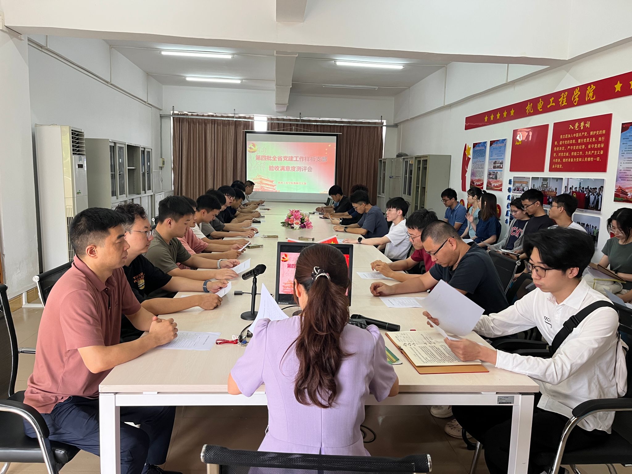 6月13日上午,伟德国际1946亚洲版教师党支部在建工机电楼305A会议室召开第四批“全省党建工作样板支部”验收满意度测评会,40名党员教师代表、非党员教师代表、员工代表参会,会议由教师党支部书记陆蕊主持。