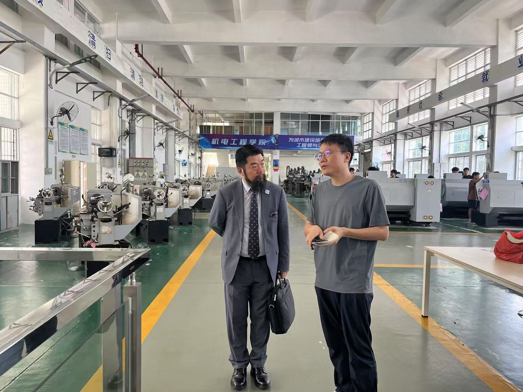 在现代智能制造中心,公司老师向John Qiu 副董事长详细展示了工业机器人编程、数字孪生技术的应用场景。在数字孪生技术演示环节,虚拟产线与现实设备的同步运行,精准模拟生产过程中的各类数据,令其驻足良久。随后,双方围绕智能制造领域的人才培养标准展开深入探讨,碰撞出诸多创新思路。