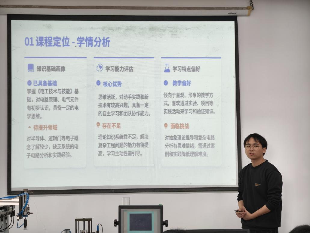 2026年3月7日,机电一体化教研室开展了教师说课活动。本次活动由教研室副主任赵永豪主持,教研室全体教师参加。本次活动评委严格按照《2026年教师说课比赛活动评分标准》,从课程定位、课程内容、教学资源、教学组织、课程特色、教学效果和教学技艺七个维度进行综合评价。活动中,各位教师依次上台进行说课。教师们紧扣课程标准,围绕专业人才培养目标,清晰阐述了课程性质与定位,合理设计了教学内容与组织过程,充分展示了各自的教学理念和教学方法,同时注重将立德树人、课程思政、岗课赛证等要素有机融入课程设计,体现了职业教育特色和校企合作、工学结合的先进理念。同时,各位教师在数字化教学资源运用、教学手段创新等方面也展现了较高的数字化素养。